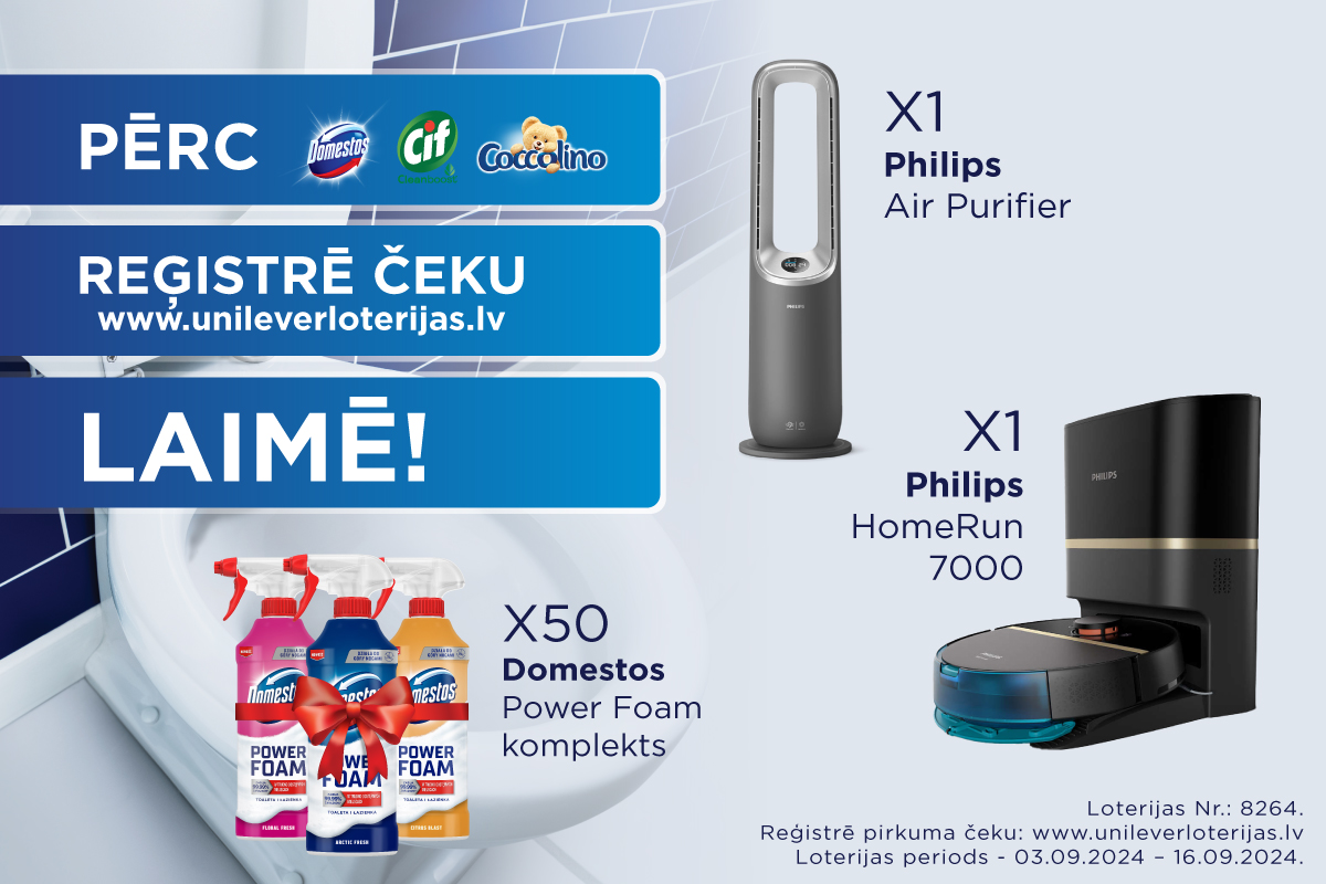 - 2.izloze notiek 2024.gada 17.septembrī, kurā piedalās Loterijas preces pirkuma čeku reģistrācijas, kas saņemtas saskaņā ar šo noteikumu 7.punktu un tā apakšpunktiem, no 2024.gada 10.septembra plkst.00:00 līdz 2024.gada 16.septembra plkst.23:59, izlozējot 25 (divdesmit piecus) Demestos produktu dāvanu komplektus, kā arī kurā piedalās Loterijas preces pirkuma čeku reģistrācijas, kas saņemtas saskaņā ar šo noteikumu 7.punktu un tā apakšpunktiem, no 2024.gada 3.septembra plkst.00:00 līdz 2024.gada 16.septembra plkst.23:59 izlozējot 1 (vienu) Philips HomeRun 7000 Aqua, Wet & Dry, Robots putekļu sūcēju, 1 (vienu) Philips Air Performer 8000 - Gaisa attīrītāju, ventilatoru un sildītāju.